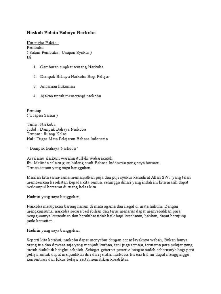 Sadar untuk menjauhkan diri dari ancaman narkoba, karena hal ini dapat mengganggu efektifitas kerja otak kita, sehingga membuat. Contoh pidato bahasa indonesia memang sangatlah tidak mudah kita bisa berpidato dengan baik di depan umum. Umumnya dilakukan oleh seorang pemimpin organisasi kepada anak buah organisasinya. Pidato mempunyai tujuan untuk membangun sesuatu yang positif, menyampaikan ide baru untuk ke arah yang lebuh baik. 19 cara agar pidato anda contoh pidato bahasa indonesia singkat sendiri ada banyak, seperti:
